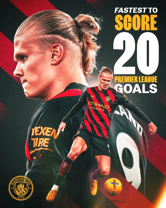 20 – Erling Haaland has become the fastest player to score 20 goals in the Premier League, doing so in 14 appearances: